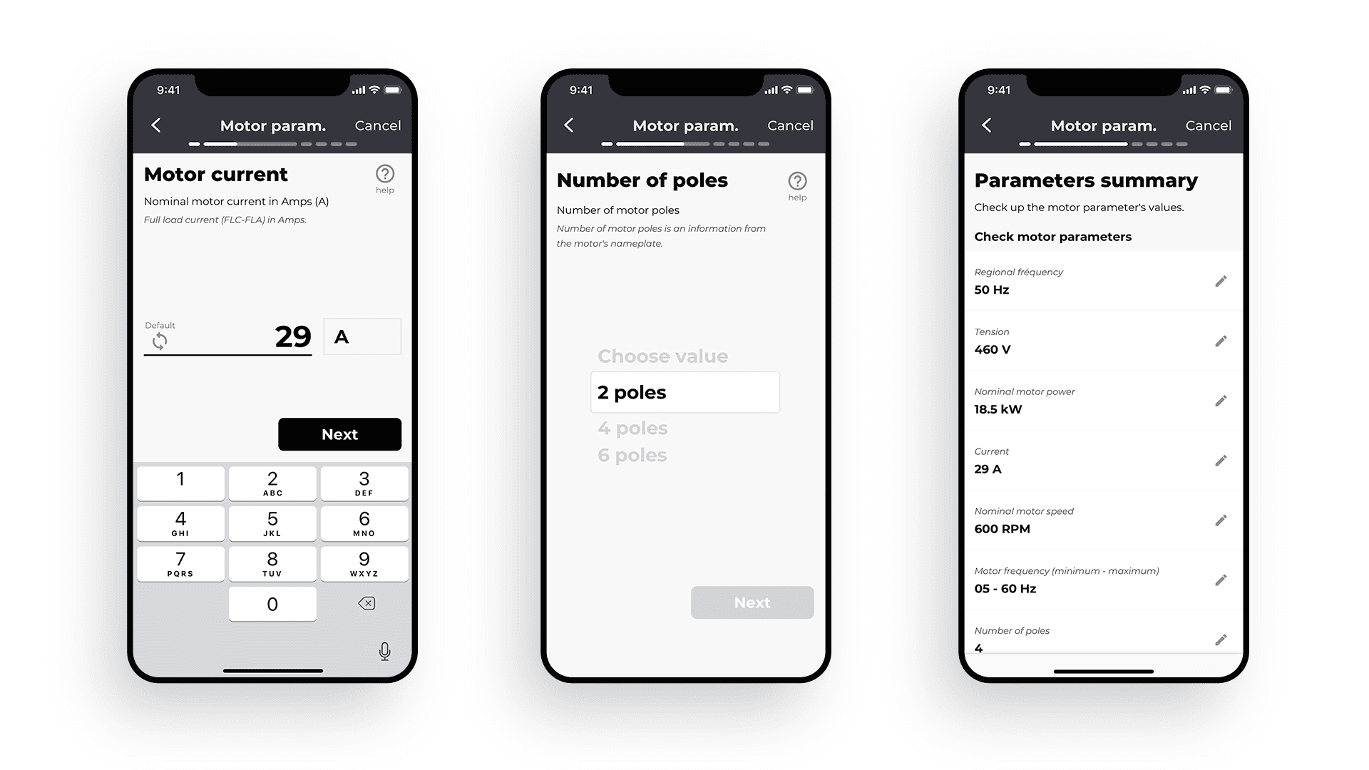 Il doit pouvoir entrer au minimum les paramètres du moteur contrôlé par le drive (courant, voltage, fréquence maximum ...). Les utilisateurs plus experts peuvent régler des paramètres plus avancés comme des alarmes, la connectivité ou encore les paramètres de réseaux.